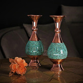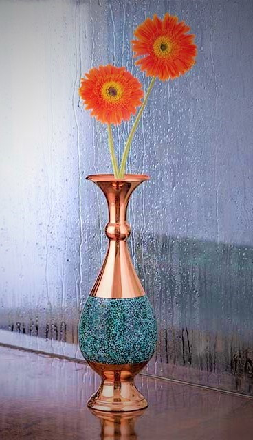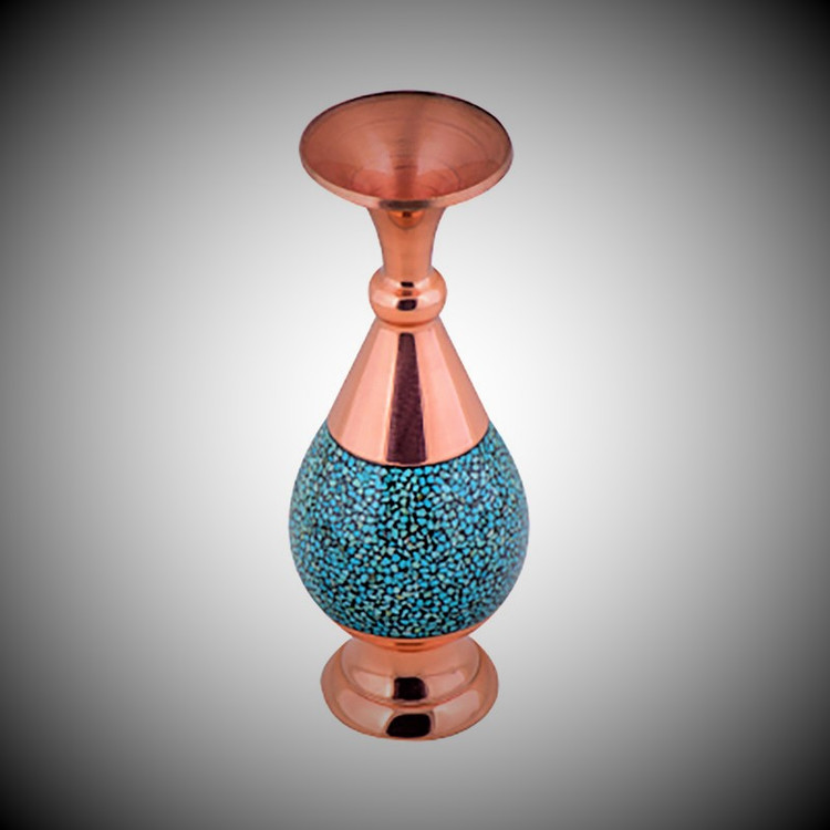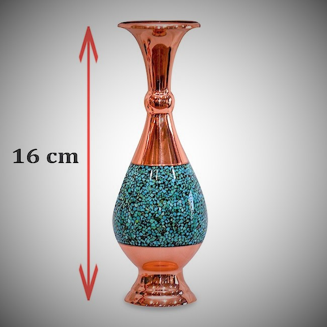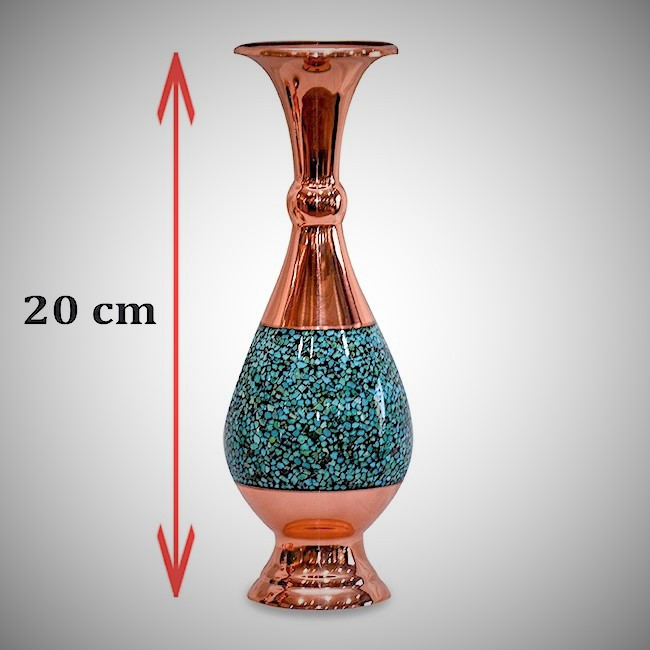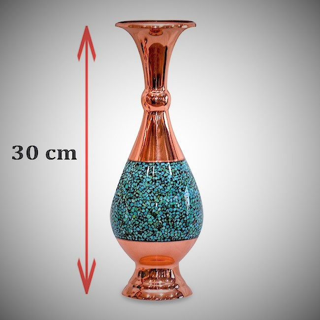 «گلدان صراحی » با چیدمان منظم سنگهای فیروزه بر سطح درخشان مس، سرشار از حس آرامش است.